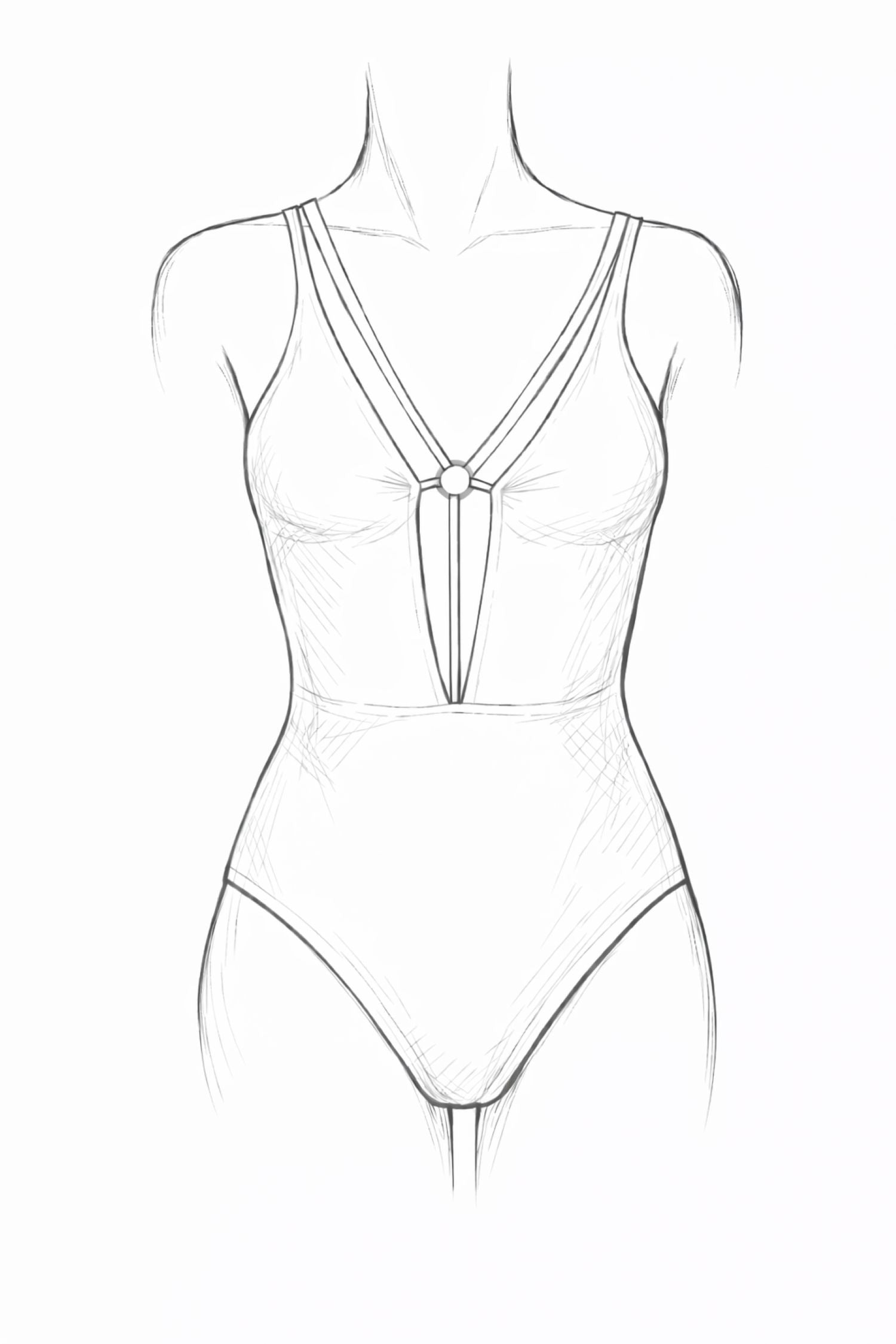 El diseño presenta un escote profundo en forma de V con tirantes dobles que se unen en un delicado aro central, creando una estructura refinada y equilibrada que estiliza el torso. La espalda abierta aporta ligereza visual y un toque sensual, manteniendo al mismo tiempo una estética limpia y elegante.