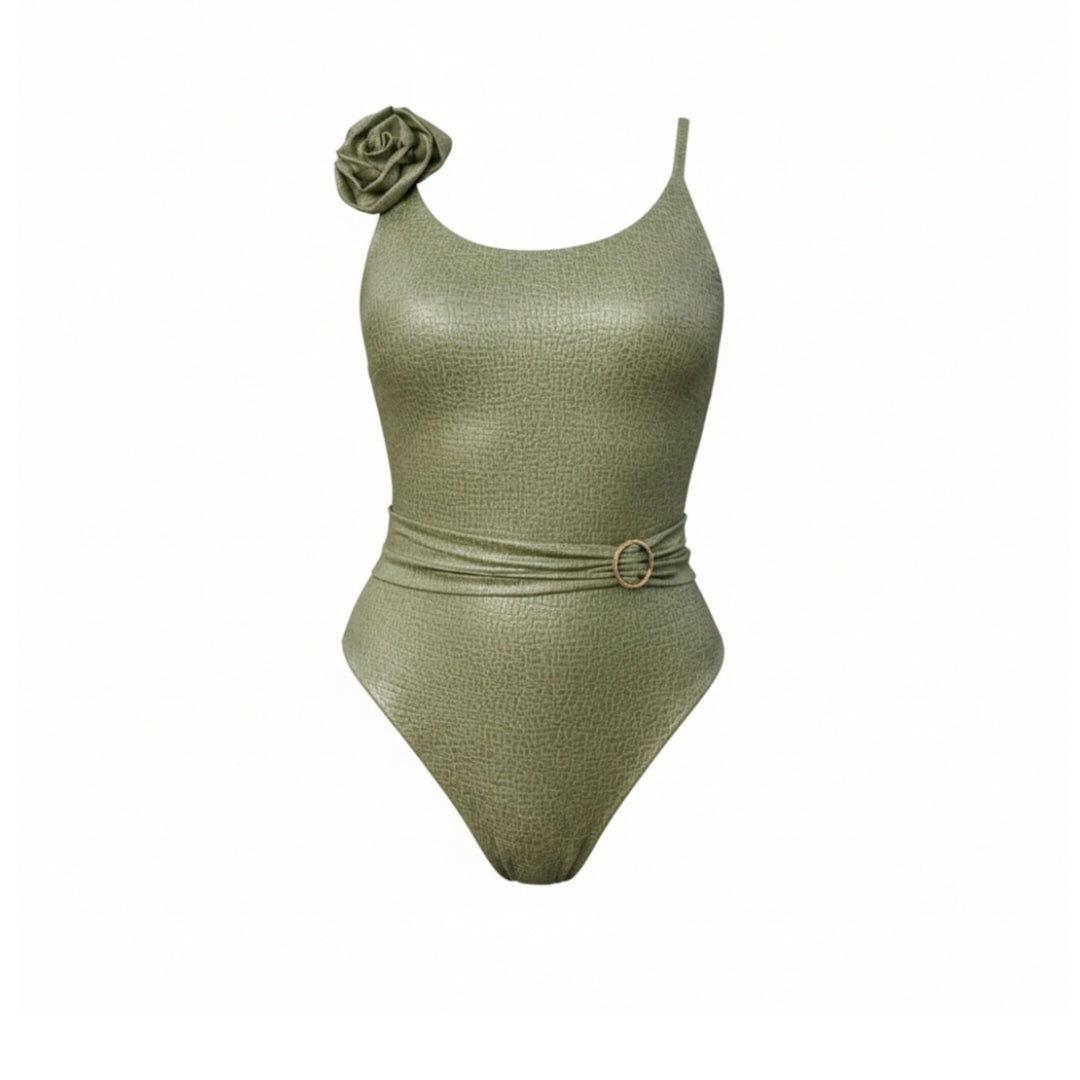 Confeccionado en un tejido metalizado verde oliva con estampado pequeño de cocodrilo, este diseño aporta textura, profundidad y un acabado sofisticado que eleva el clásico bañador de una pieza.